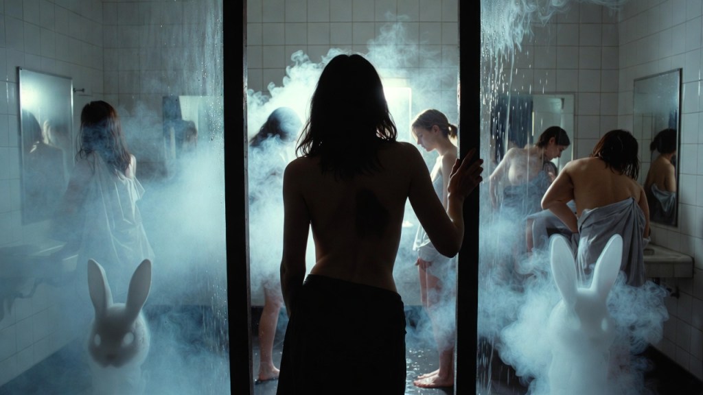 The steam thickens and shapes form in it briefly—earcurve where there is only towelhook, holloweye where there is only drain-shadow—and the rabbitmask flickers not solid but suggestion and she blinks and the mask dissolves and the water continues untroubled and she tells herself hallucinationonly steamonly but the body remains alert beneath the cascade and when someone laughs sharply behind her she startles smallsharp and the startle ripples outward and is seen and misread and folded into whatever story already circulates.