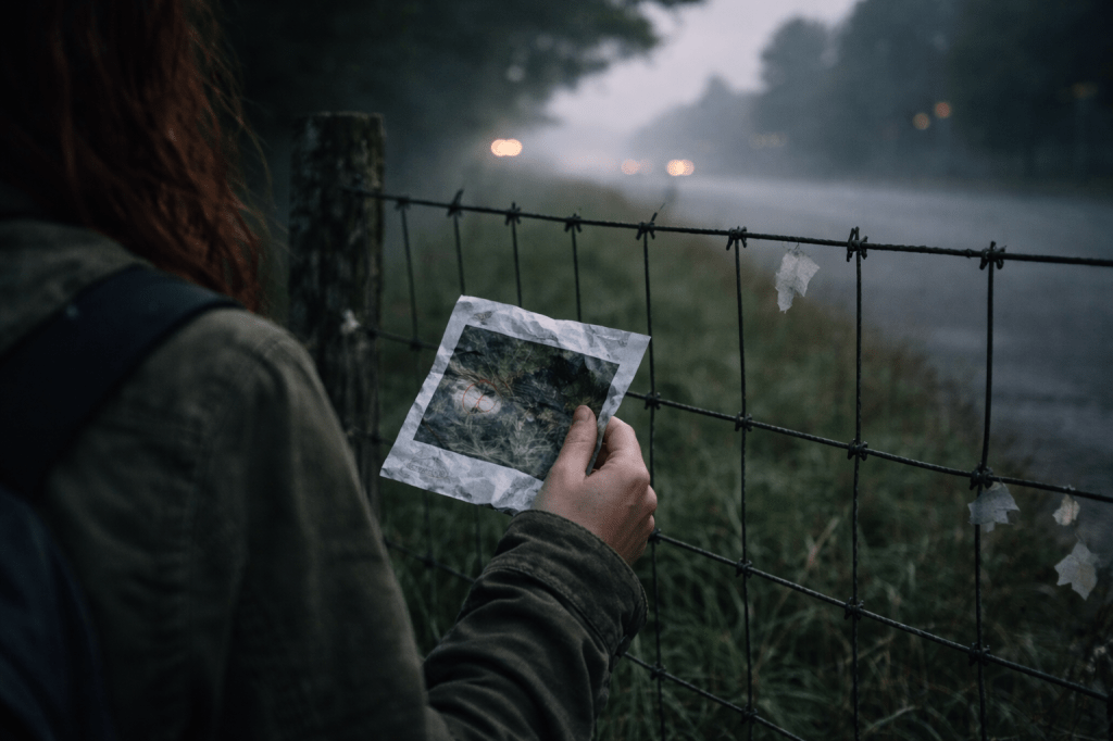 She reaches into her pocket and withdraws the crumpled fragments and smooths one sheet against the fence trying to align it with the phantom stapleholes and the grassclose image stares up again shadowleaning and she realizes with a slow unsettling clarity that the copies may have vanished from the world but the trace has already migrated into her—into the archive of eye and nerve and rumor and memory—and she folds the paper once more and walks away carrying the only remaining evidence of something the town now pretends never existed.
