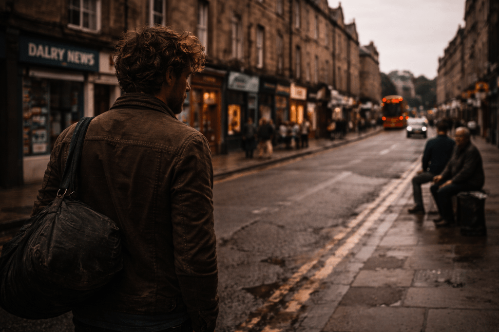 I walk Dalry Road the way you walk a tune you half-remember, footfall syncopated, step-step-hold, the street coming at me in bars and breaks, bus-hiss, shopclatter, stone still holding the night in its pores, and I’m listening harder than I should because this is where he used to be, Jamie-place, Jamie-angle, Jamie-lean, and the habit of looking for him hasn’t worn off yet, not quite, not even now.